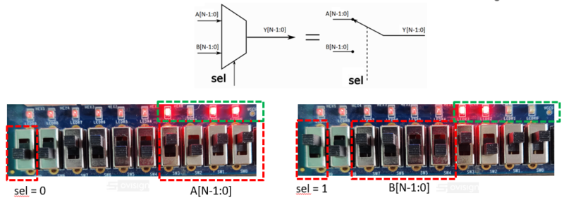 The mux output will light up the FPGA development board LEDs 💡 according to the board’s switches positions.